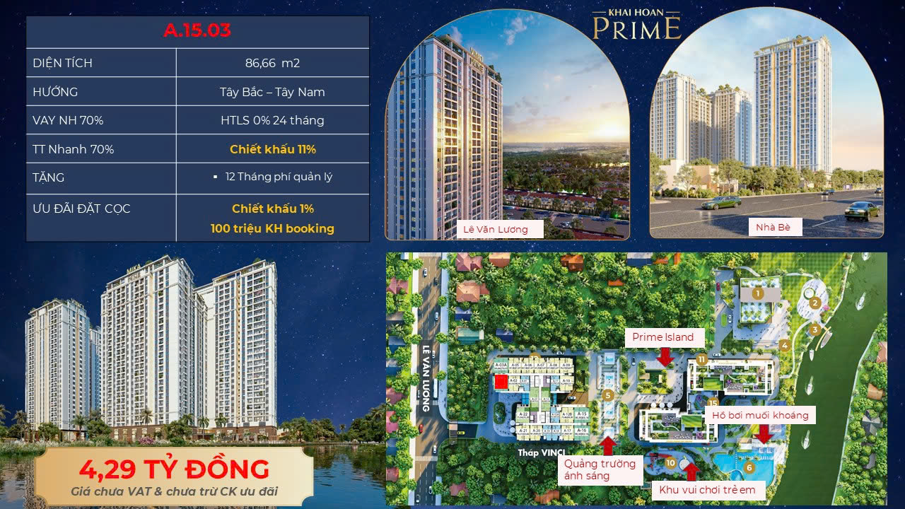 Căn hộ Khải Hoàn Prime tọa lạc tại mặt tiền đường Lê Văn Lương , Xã Nhơn Đức Huyện Nhà Bè – Thành Phố Hồ Chí Minh thuộc khu đô thị Phía Nam Thành Phố Hồ Chí Minh do Tập Đoàn Khải Hoàn Land làm chủ đầu tư