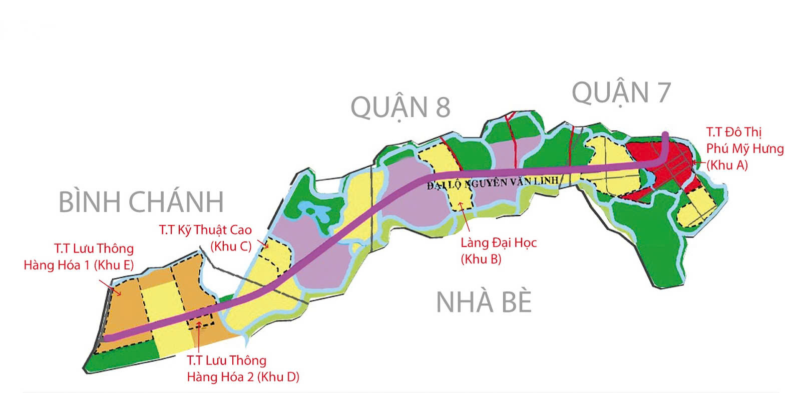 • Khu đô thị thành phố Phía Nam  bao gồm các quận : quận 7 – Quận 8 – Huyện Nhà Bè & một phần huyện Bình Chánh dọc theo trục đường Nguyễn Văn Linh & & Cần Gio