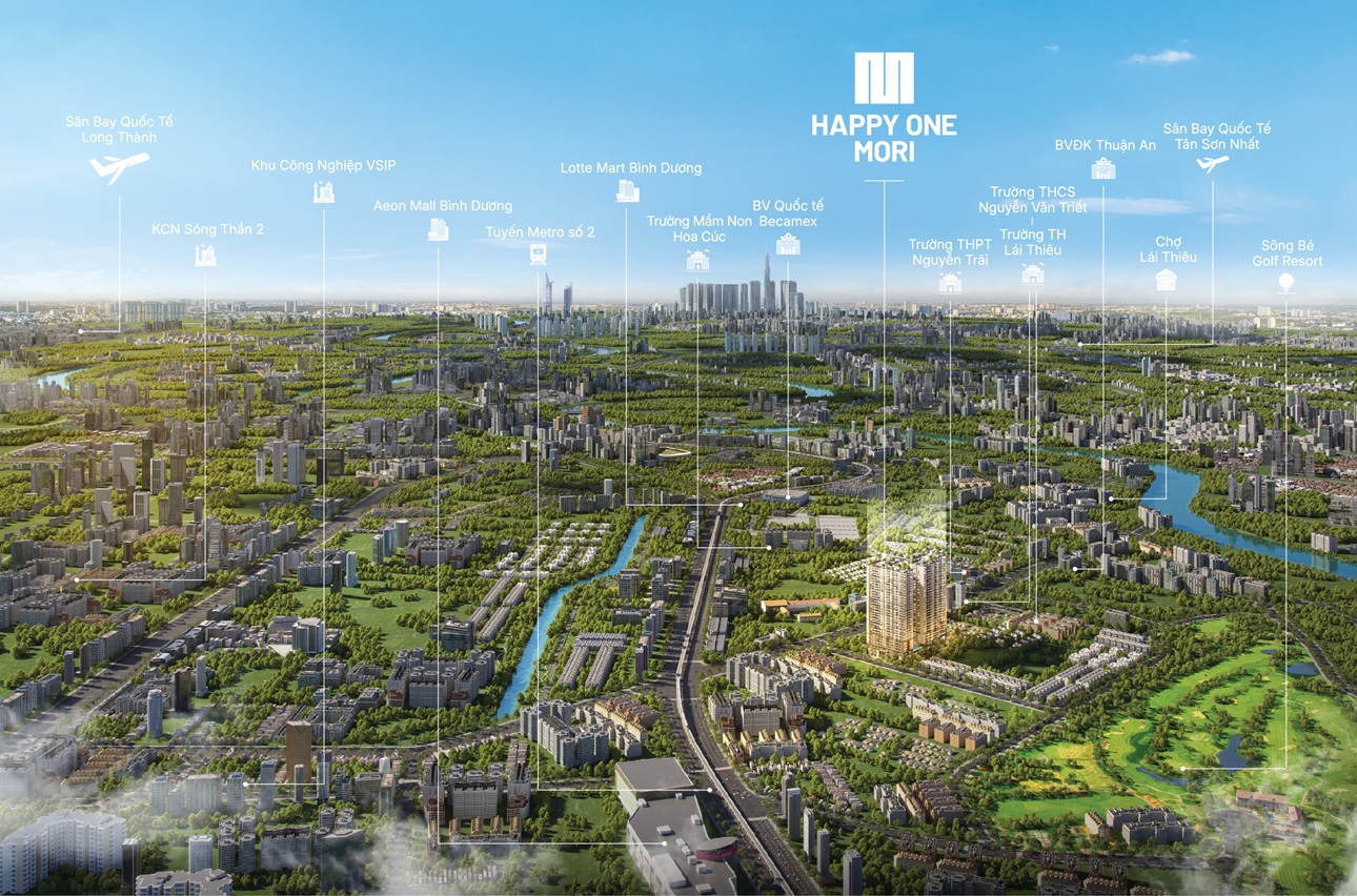 Happy One Mori là dự án căn hộ chuẩn chuyên gia tại Đông Bắc Thành phố Hồ Chí Minh, liền kề Quốc lộ 13 và tuyến Metro Số 2, thuận lợi di chuyển tới các khu công nghiệp lớn, trung tâm TP.Hồ Chí Minh và các đô thị vệ tinh. Nhờ hạ tầng được thúc đẩy mạnh mẽ, Dự án căn hộ Happy One Mori mang đến trải nghiệm sống hiện đại, thuận tiện, phù hợp cả an cư lâu dài lẫn đầu tư bền vững.