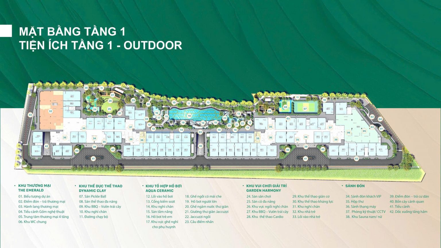 Tầng trệt  hay còn gọi tầng 1 được quy hoạch như một khu nghỉ dưỡng khép kín, tập trung vào các hoạt động ngoài trời. Dưới đây là mặt bằng chi tiết với hơn 42 tiện ích: