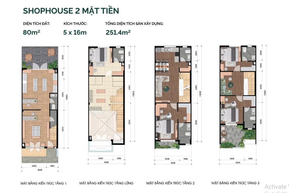 • Shophouse Larita đa năng : : 80m2 (5×16) ; 105m2 ( 5×21)